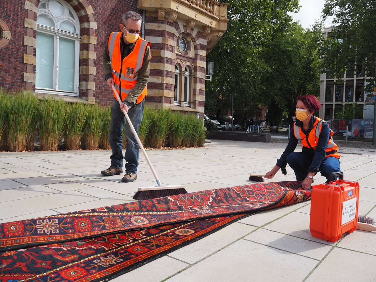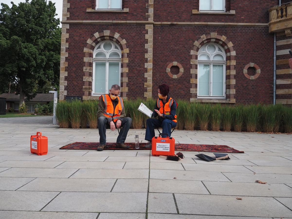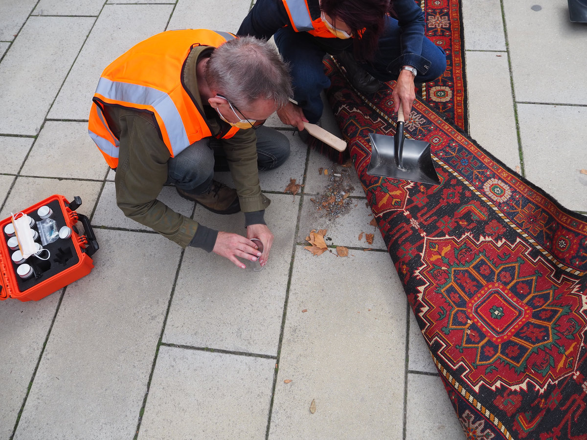 Die Akteure legen bei der Ankunft an den Orten einen Teppich aus, um die umliegenden Partikel unter den Teppich zu kehren und mit rhythmischen Bewegungen des Teppichs zu vermischen. Im Anschluss wird der Teppich Stück für Stück aufgerollt und Proben der sich darunter befindenden Partikel systematisch in kleine verschraubbare Behältnisse verbracht, deren Etikettierungen mit Datum, Uhrzeit und Fundort versehen werden.