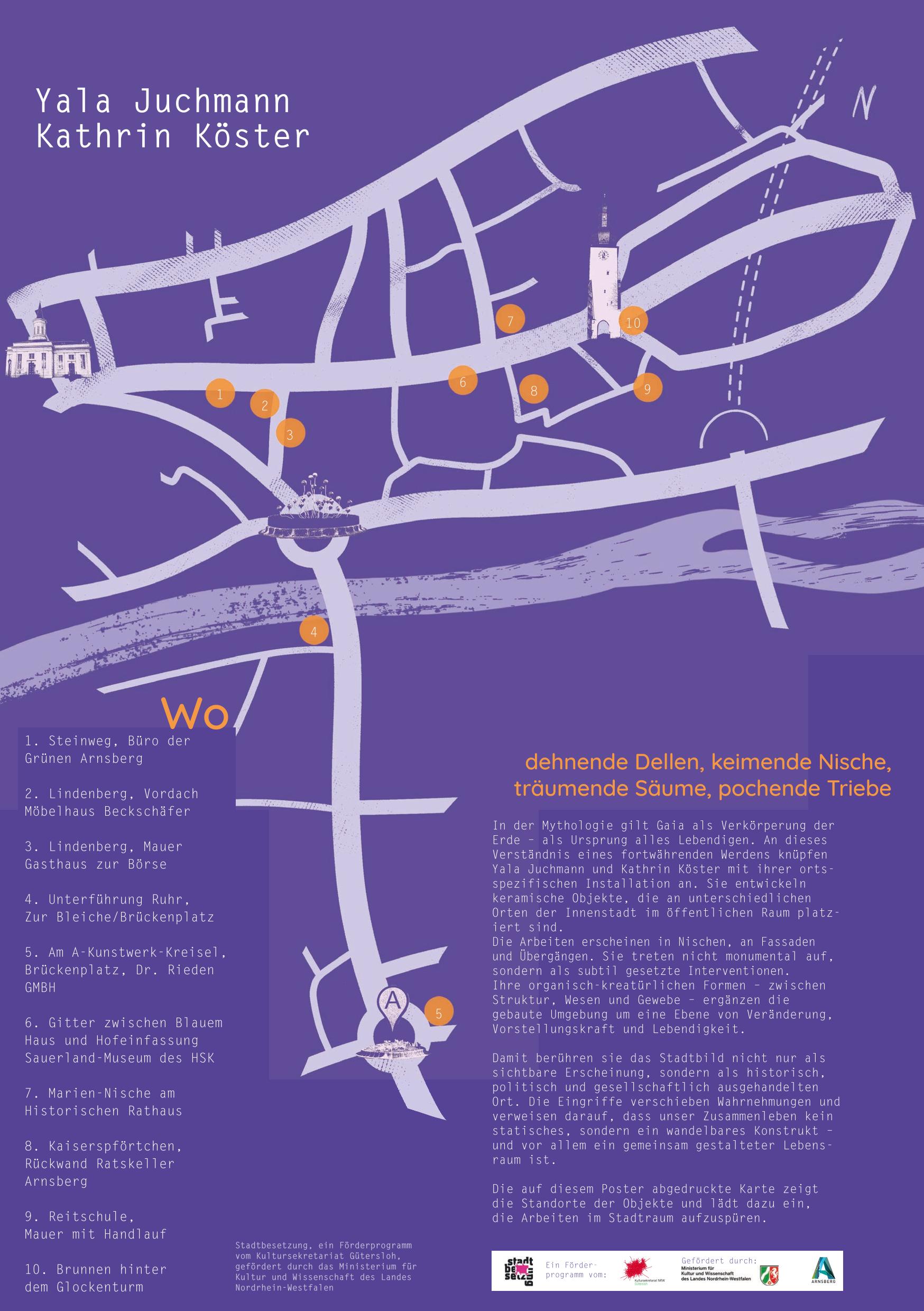Die Zusammenarbeit von Theresa Kampmeier und Ramona Schmitt war geprägt durch atmosphärische Erkundungen im und um Arnsberg. Sie beschäftigten sich intensiv mit der alltäglichen Aufenthaltsqualität des öffentlichen, urbanen Raums. Was oder wo genau ist das Zentrum von Arnsberg? Ist das Zentrum am Glockenturm oder ist es vielleicht beim roten Markierungspin im Kreisverkehr? Oder ist es eine diffuse Gegend, die vor dem Altstadttunnel beginnt und erst bei den Ruhrwiesen wieder endet? Wo löst sich der städtische Anspruch auf Urbanität ein?
