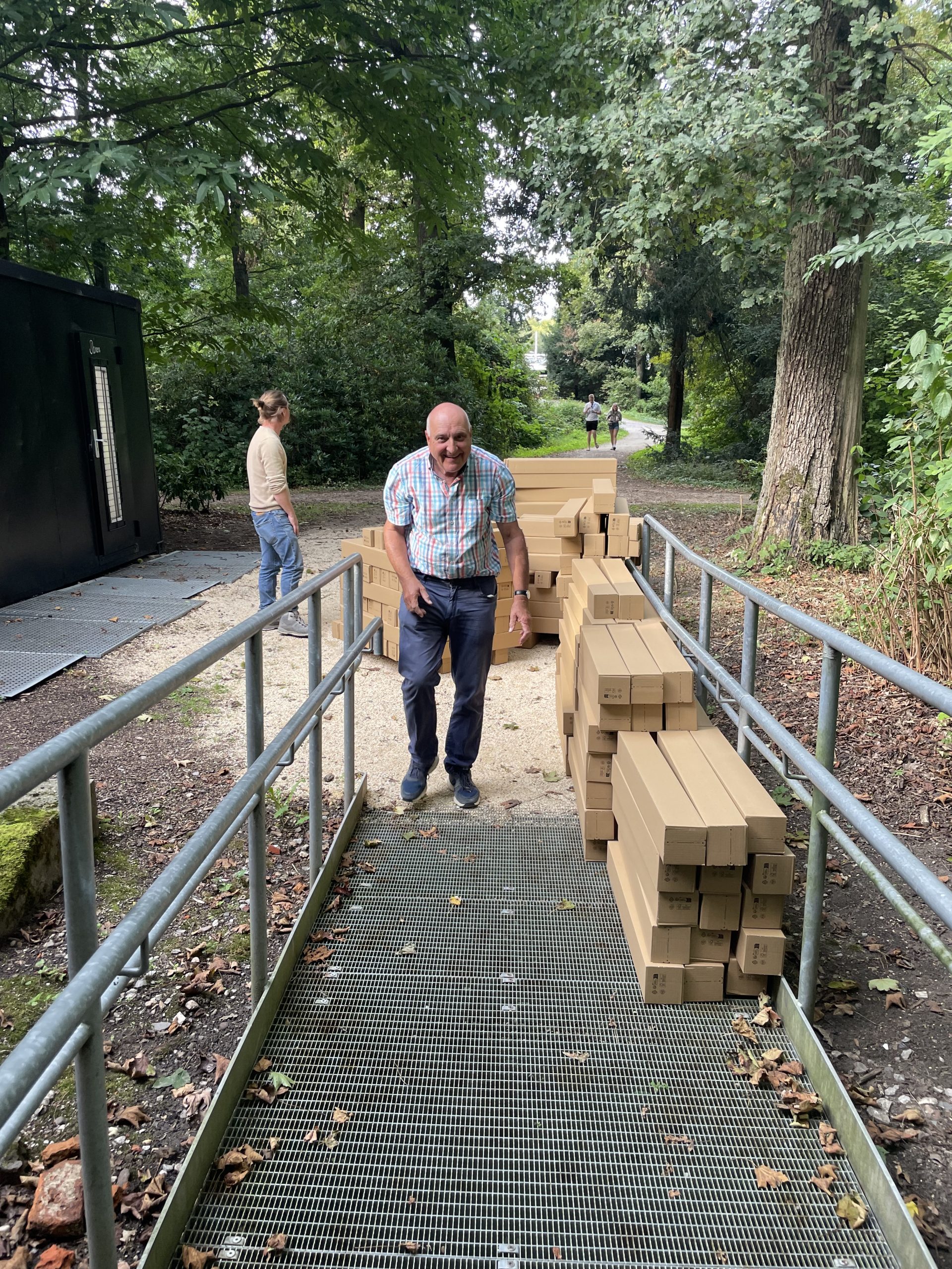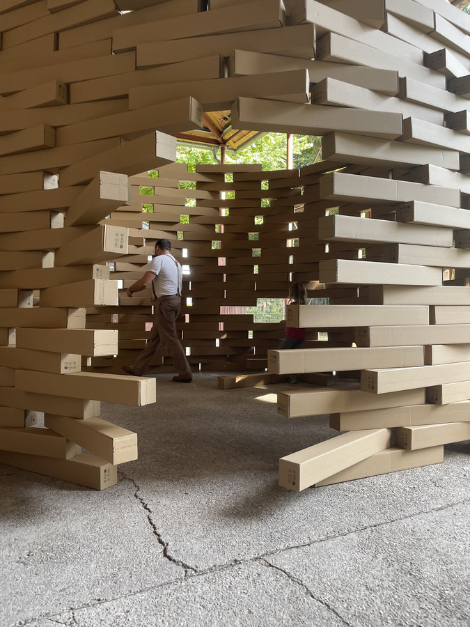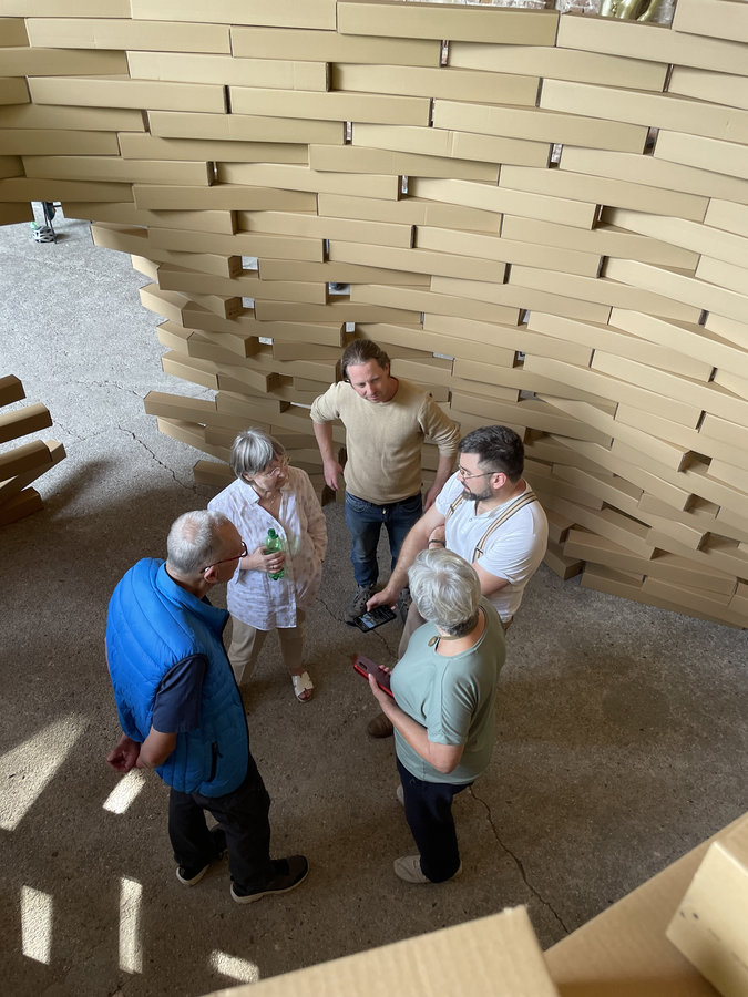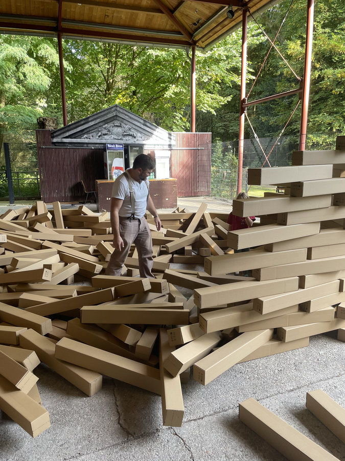 Die insgesamt 300 Kartons – die Zahl war angelehnt an das 300-Jahre Orangerie-Jubiläum – wurden von Garvin Dickhof dann abschließend im Innenraum der Orangerie zu einer begehbaren Skulptur zusammengefügt. Die Installation lud das Publikum ein, den Raum im Raum und die Architektur aus einer neuen Perspektive zu sehen.