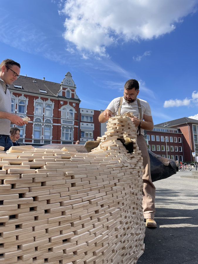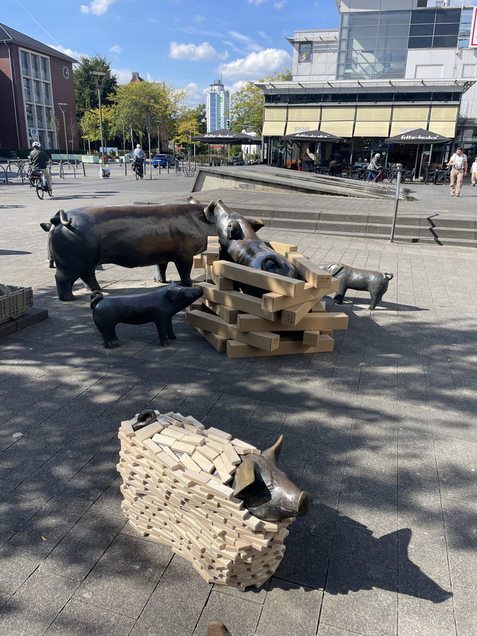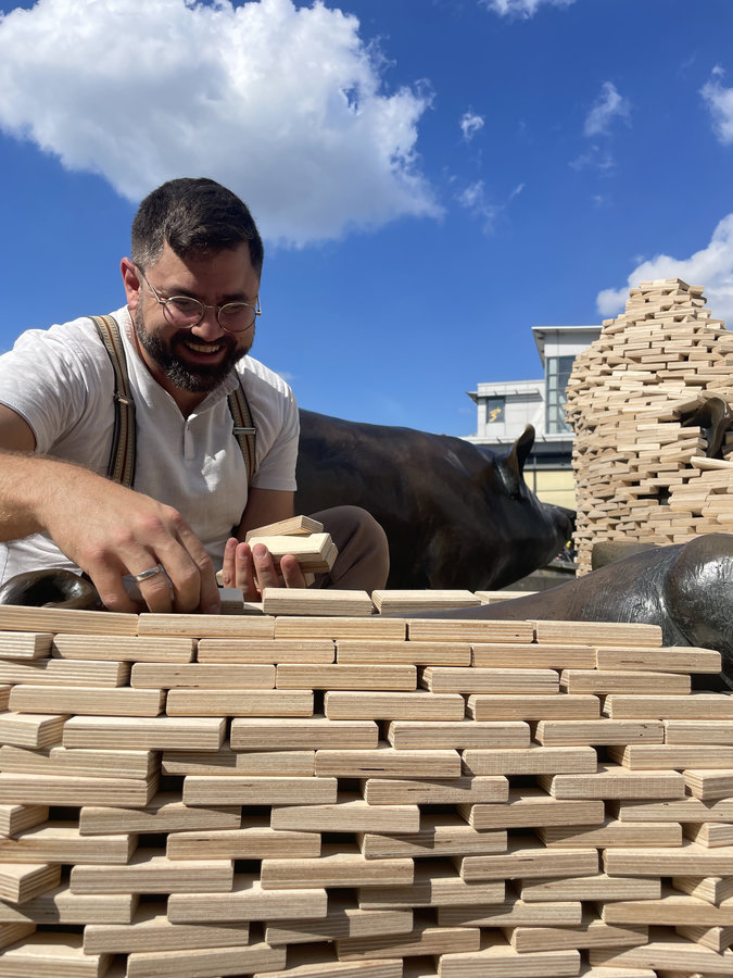 Bei der ersten Arbeit „DisCover“ forderte Garvin Dickhof sich und alle, die Lust hatten mitzumachen, heraus, mit tausenden 1,75 x 3,5 x 10,5 cm großen Holzklötzchen einzelne Figuren aus der viel beachteten Schweineherde von Peter Lehmann am Otto-Wels-Platz zu umbauen. Die beliebten Objekte sollten dadurch für eine kurze Zeit dem gewohnten Blick entzogen werden und neue Gestalt annehmen. Kein Wunder, dass diese Aktion sehr schnell vor allem Kinder animierte mitzumachen. Aber auch Erwachsene trauten sich, das ein oder andere Klötzchen zu setzen. Das geschah nicht immer passgenau, sodass mancher Mauereinsturz zu beklagen war. Der Künstler sah dies aber als gerne in Kauf genommenen Teil der Performance. Einige Schweine verschwanden in der dreistündigen Aktion dann doch unter dem Beifall des Publikums bis zur Schnauze in einem Mantel aus Holzklötzchen.