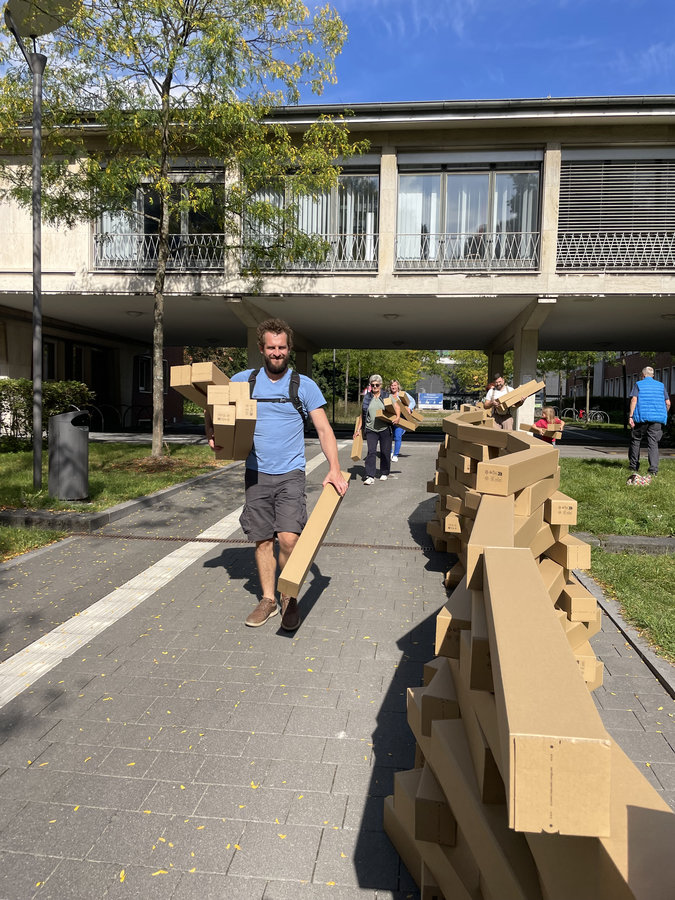 Die zweite Aktion des Künstlers, der „WanderWall“, animierte das Publikum ebenfalls zum Mitmachen. Aus einem Berg von Pappkartons, jeder 11 cm breit und 88 cm lang, errichte Garvin Dickhof den Anfang einer Mauer an der Baumtreppe vor dem Rathaus, die in den Schlosspark führt. Mit tatkräftiger Unterstützung des Publikums begann die Mauer nun zu wandern, indem Kartons hinten abgebaut und vorne wieder aufgebaut wurden. So wanderte der WanderWall vom Rathaus über die Unterführung in den Schlosspark. Die Mitwirkenden entwickelten ein erstaunliches hohes Bautempo und waren fasziniert von diesem fremden Element in einer ihnen bekannten Umgebung sowie der ständigen Veränderung seiner Form. Möglicherweise ließ sie das auch über die Frage nachdenken, welche Grenzen unser Leben bestimmen und wie wir sie verschieben oder überwinden können. Gemeinsam gelang es, den WanderWall aus Kartons bis zur Orangerie zu verschieben.