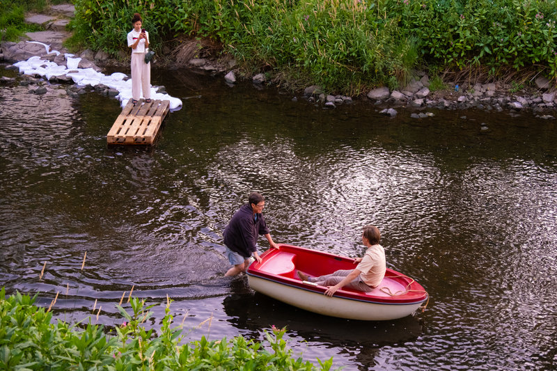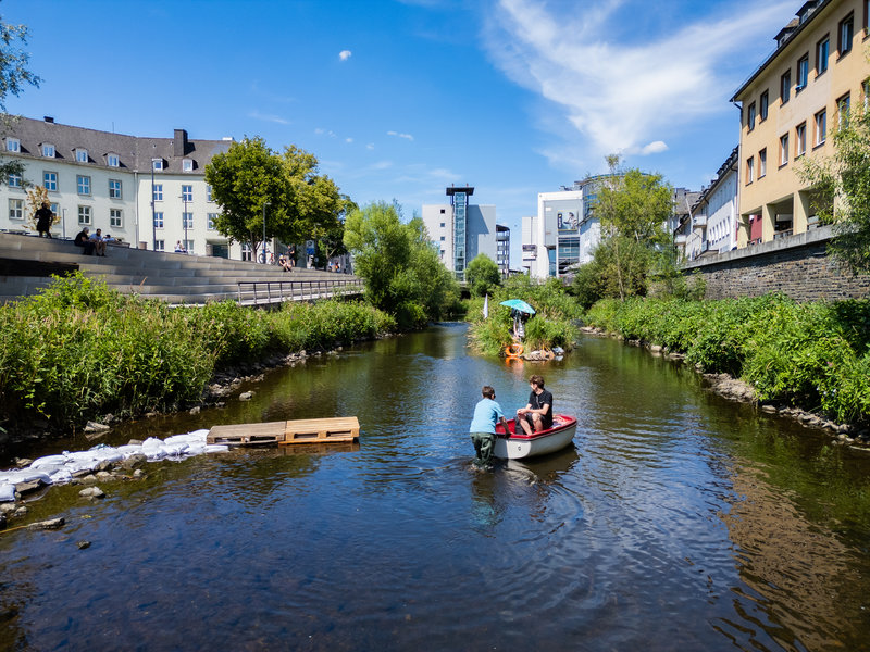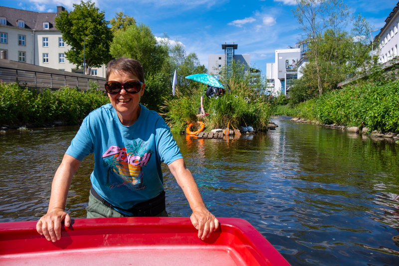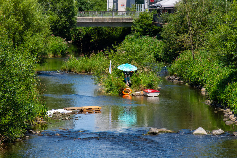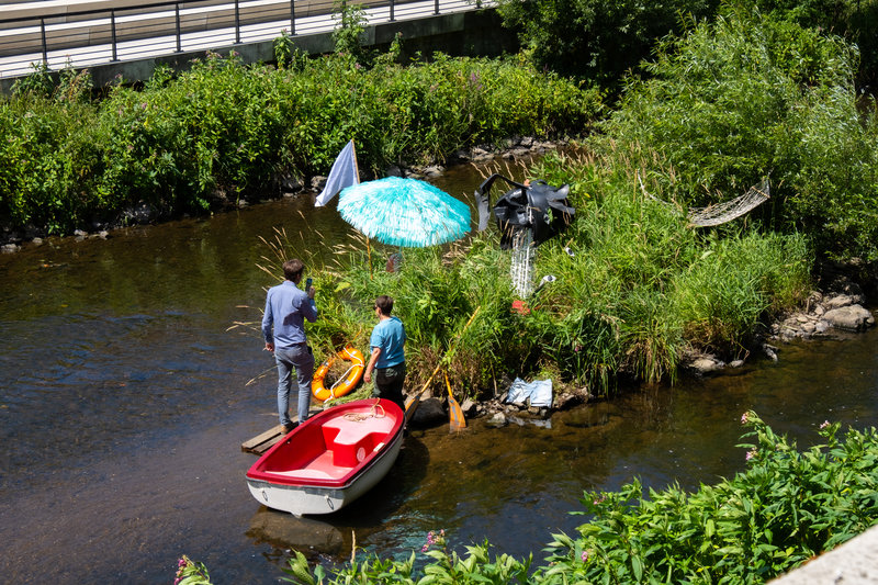 Die Kunstaktion von Andrea Freiberg überrascht mit einer exotischen Insel-Schiff-Situation mitten in der Sieg.